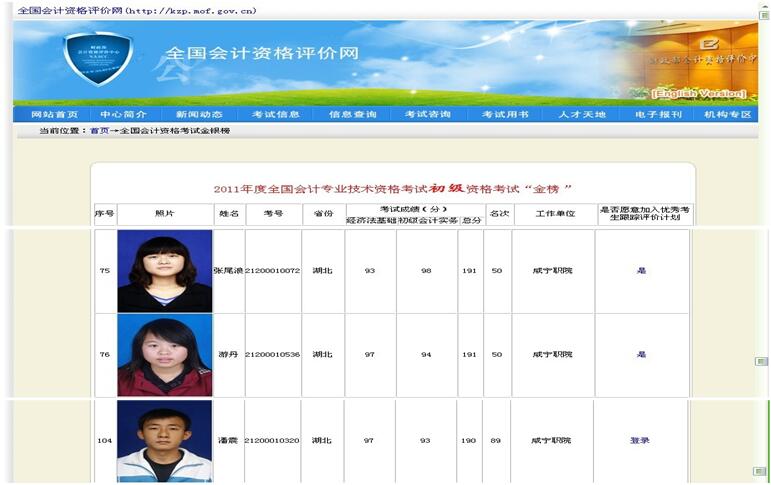 更加难能可贵的是在2011年中,张尾浪、游丹、潘震3位同学荣登全国初级考试金榜并被财政部作为优秀考生跟踪评价(162万人参考总分前100名),刘敏、饶芳同学荣登湖北省初级考试银榜(除入围金榜者外,湖北省总分前30名)。张尾浪以《初级会计实务》单科98分、潘震以《经济法基础》单科97分均列全国第三名,湖北省第一名。2012年又有2位同学入围湖北省银榜;2016年赵依同学荣登全国初级考试金榜并被财政部作为优秀考生跟踪评价;2017年有4名同学入围湖北省银榜,